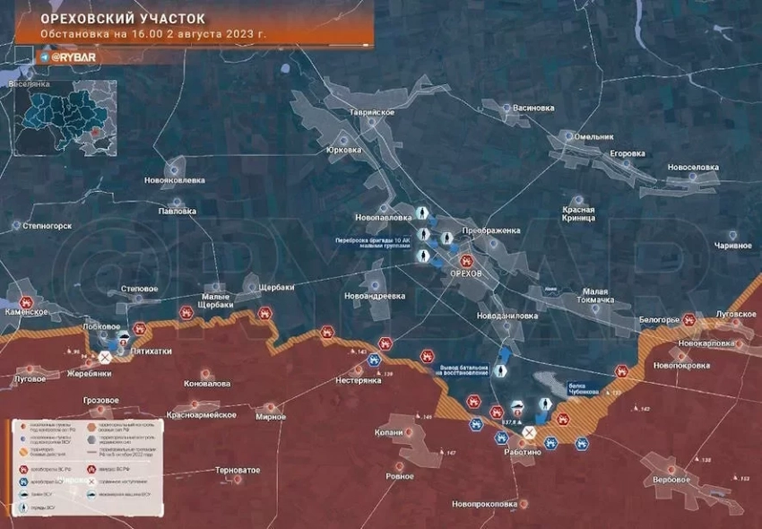 Свои основные усилия украинские войска сосредоточили на Запорожском направлении. Именно здесь началось контрнаступление, которое сразу же столкнулось с мощными оборонительными позициями армии Российской Федерации, после чего застопорилось.