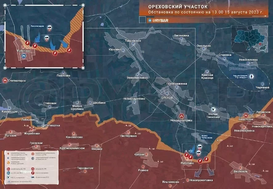 Судя по вклиниванию ВСУ к востоку от села, украинское командование хочет взять Работино в полуокружение и ударить механизированным кулаком на направлении Токмака. Однако появление ТГр «Марун» на данном этапе заставляет задуматься, что планы противника из-за потерь в 118 омбр пришлось корректировать.