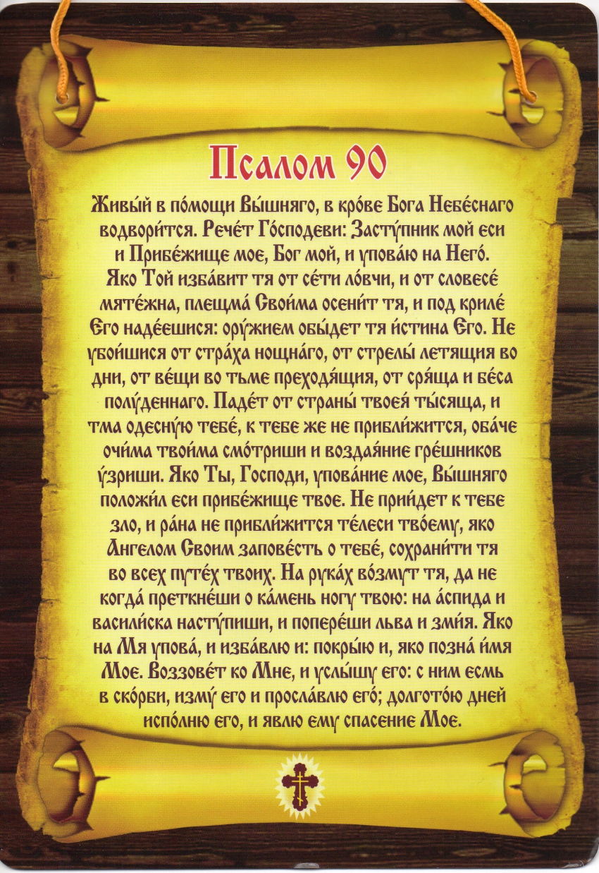 Живый в помощи Вышняго, в крове Бога Небесного водворится. Речет Господеви: Заступник мой еси и Прибежище мое, Бог мой, и упаваю на Него. Яко Той избавит тя от сети ловчи, и от словесе мятежна плещма Своима осенит тя и под криле Его надеешися: оружием обыдет тя истина Его. Не убоишися от страха ночнаго, от стрелы летящия во дни, от вещи во тме преходящия, от сряща и беса полуденнога.