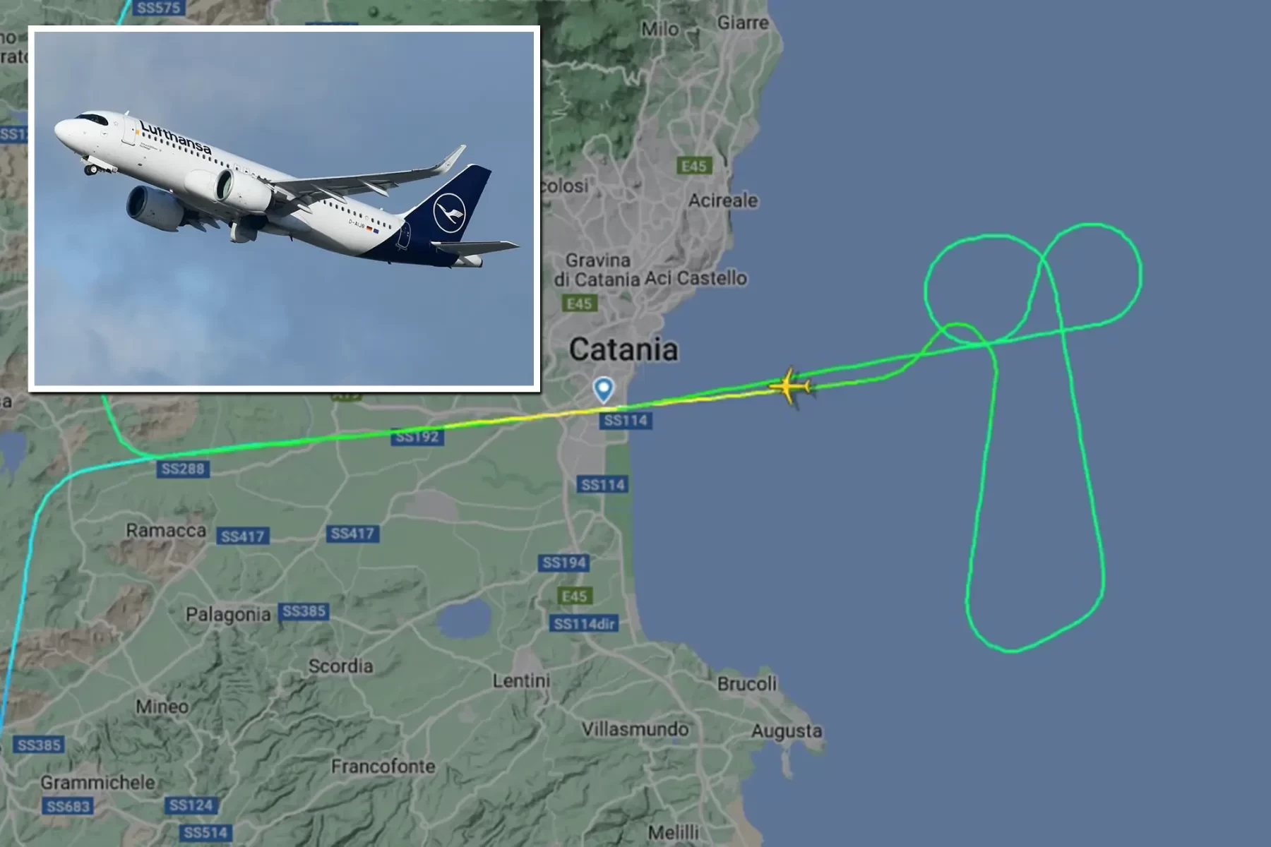 Пилот авиакомпании Lufthansa в небе нарисовал самолетом после того, как ему не разрешили сесть в аэропорту Катании (Сицилия). Об этом пишет сегодня New York Post.